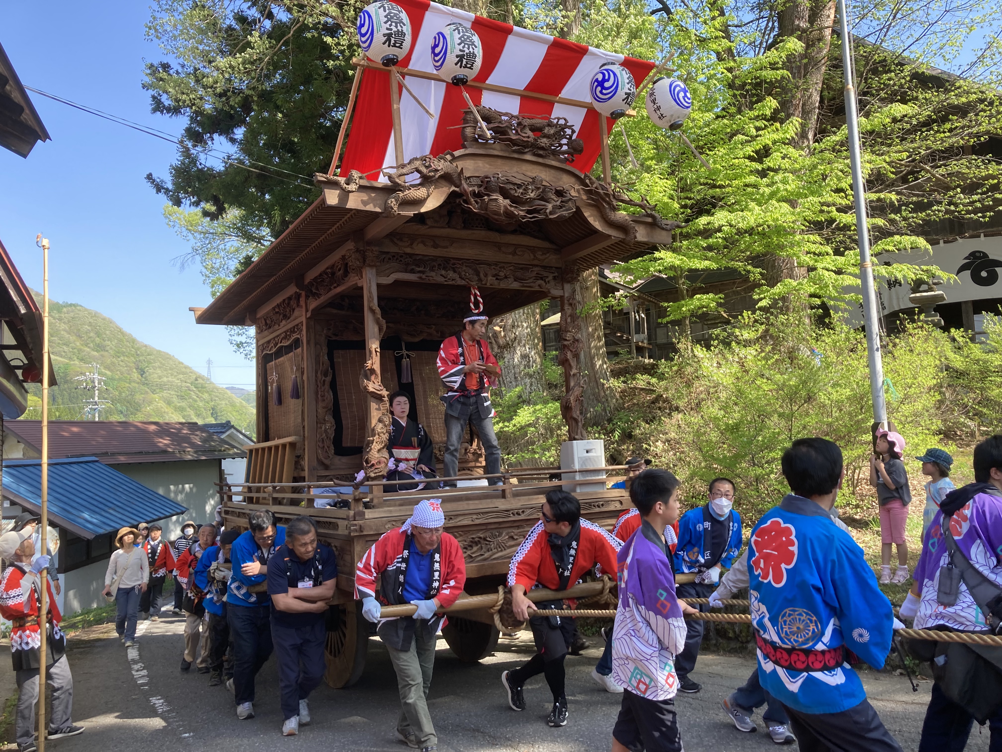 屋台は、松巌寺前で踊りを披露した後、神楽と列を作り、地域住民が綱を引きながら鬼無里神社へ向かいます。鬼無里神社の鳥居前で舞を披露した後、鬼無里神社に向かって舞を奉納します。その後、鬼無里神社の舞台で神楽(獅子舞)が奉納されます。