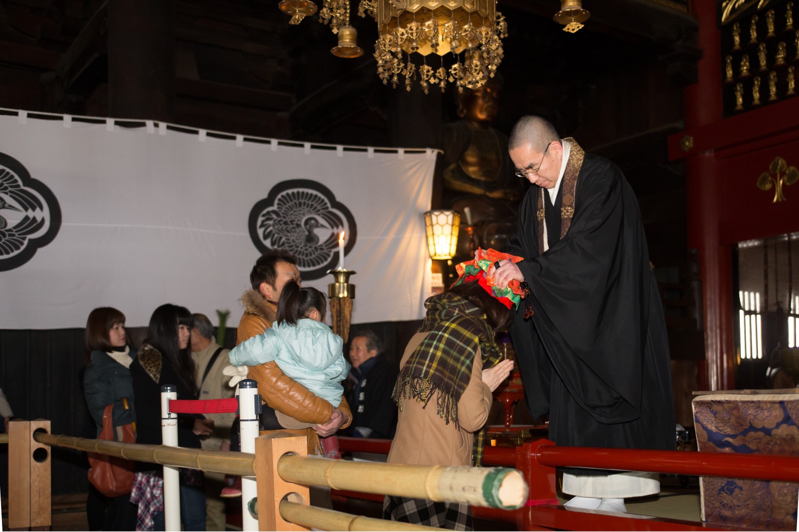 除夜の鐘を合図に、大勧進と大本願の両住職及び天台宗と浄土宗の全山僧侶が出仕し、午前1時から執り行われる新年最初の法要です。